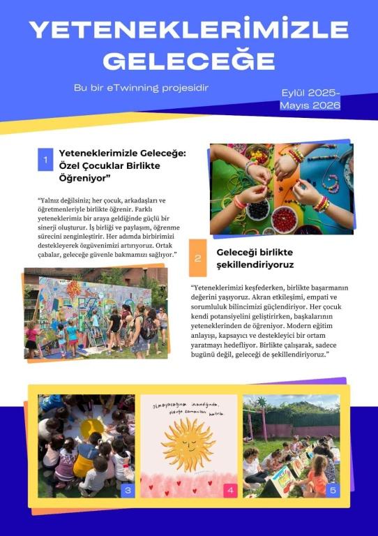 4. sınıf Örencileri ve öğretmenlerinin katılımıyla Yeteneklerimizle Geleceğe E-Twinning Projemiz başlıyor. Açıklamalar ile ilgili broşürümüzü inceleyebilirsiniz.